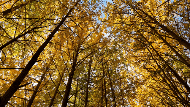 숲속 바람에 흔들리는 가을의 단풍 나무