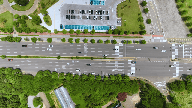 녹지로 둘러쌓인 번화한 교차로의 항공 뷰