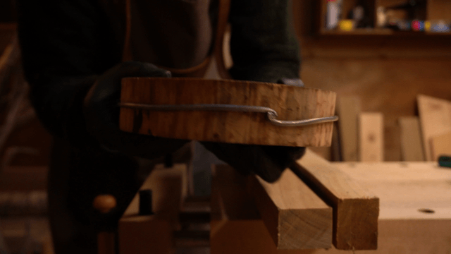 작업장에서 목재에 긴 볼트를 조이는 목공