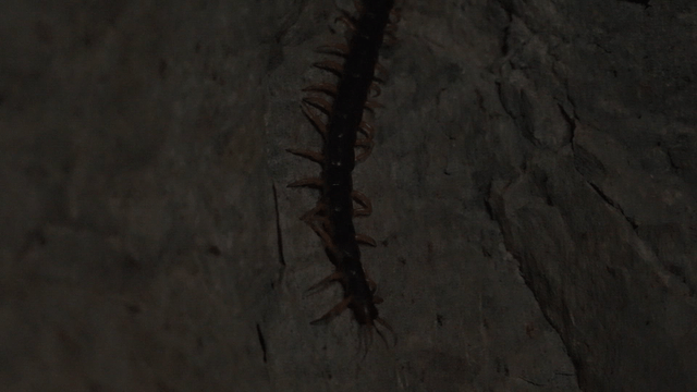 구멍 뚫린 금속 표면 위를 기어가는 굼벵이