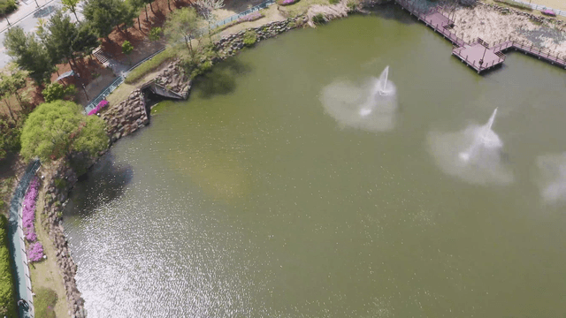 놀이터와 산책로가 있는 공원의 항공 뷰