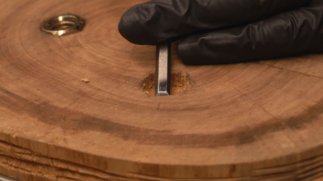 장인이 끌로 나무 조각의 구멍을 만드는 모습