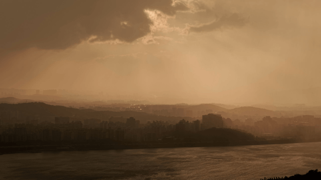 산 너머 극적인 노을과 도시 풍경