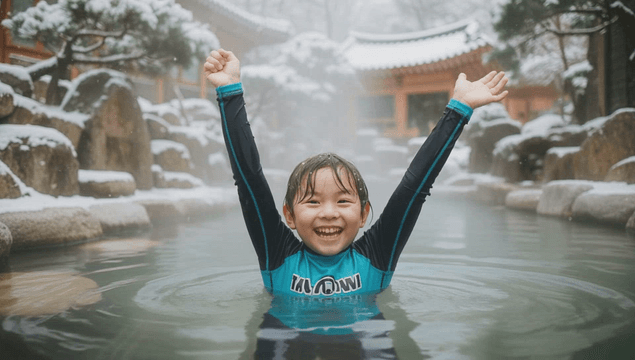 눈 덮인 풍경 속 온천을 즐기는 여성들