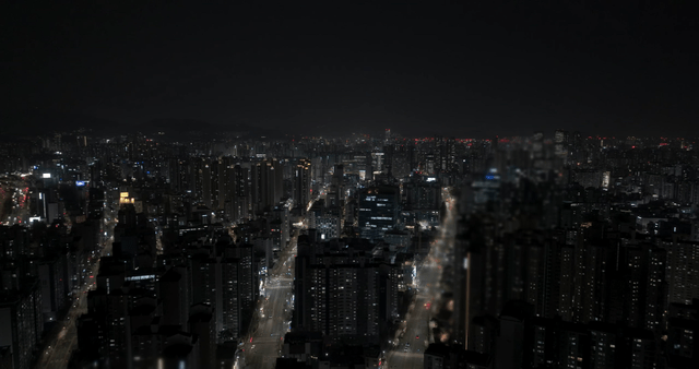 번화한 대도시의 불 밝혀진 밤풍경 항공 촬영
