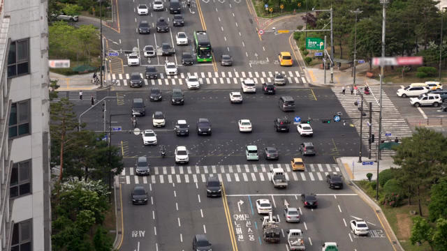 시내버스와 차량이 오가는 도시의 분주한 교통상황