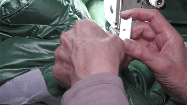 장갑 낀 손으로 가죽 조각을 바느질하는 모습