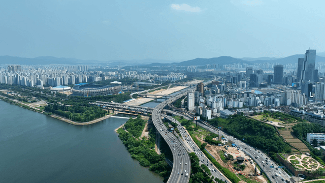 한강과 도시를 연결한 다리가 있는 도시 전경
