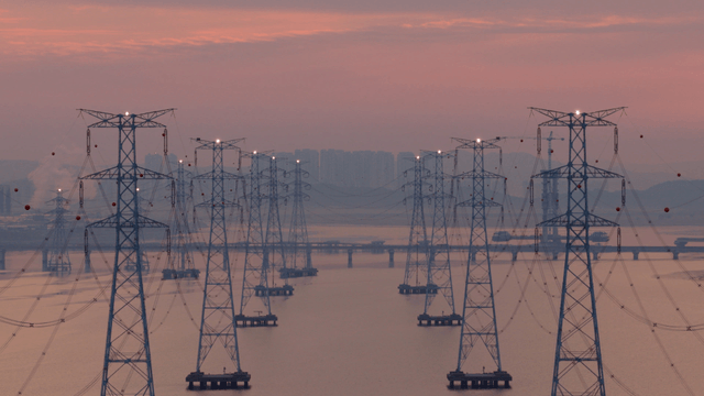 강 위 일몰을 배경으로 이어진 송전탑 전선