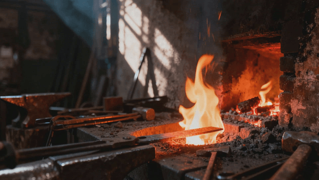 작업장에서 뜨거운 금속을 단조하는 대장장이