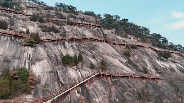 바위산에 있는 붉고 가파른 계단을 오르는 등산객