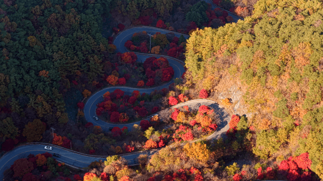 알록달록한 가을 숲을 지나는 구불구불한 도로