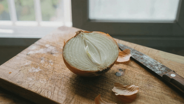 나무 도마 위의 네 개의 양파