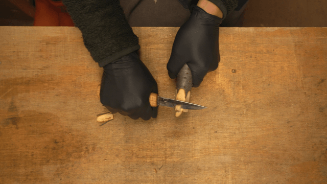 작업대에서 칼로 진행 중인 목각
