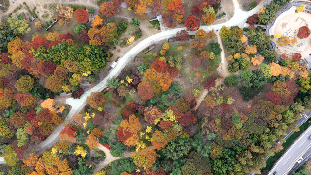 알록달록한 가을 숲을 지나는 구불구불한 도로