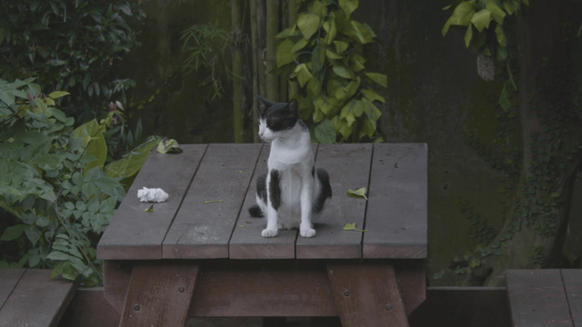 정원에 있는 나무 테이블 위에 앉아 있는 고양이