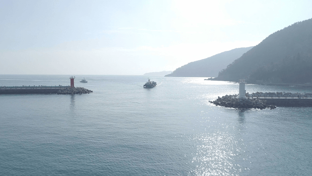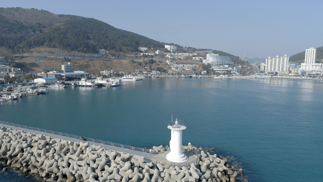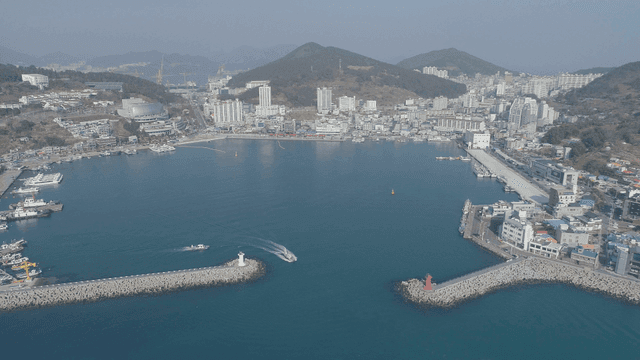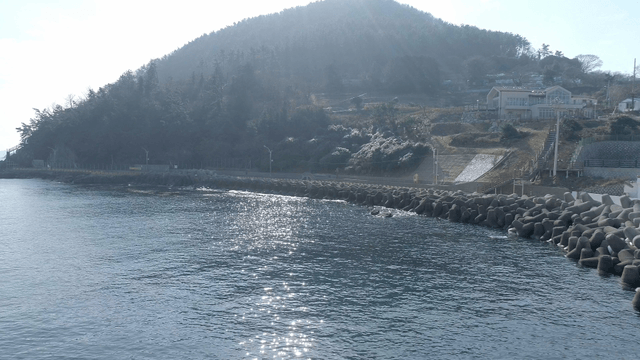 산을 배경으로 한 방파제와 바다