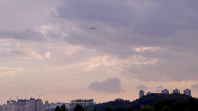 다채로운 저녁 하늘 비행기와 도시 스카이라인