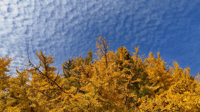 맑은 하늘 아래 황금빛 가을 잎