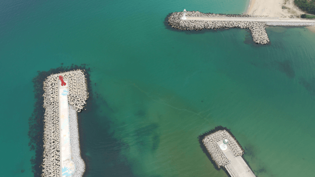 멀리에 긴 방파제가 보이는 잔잔한 바다