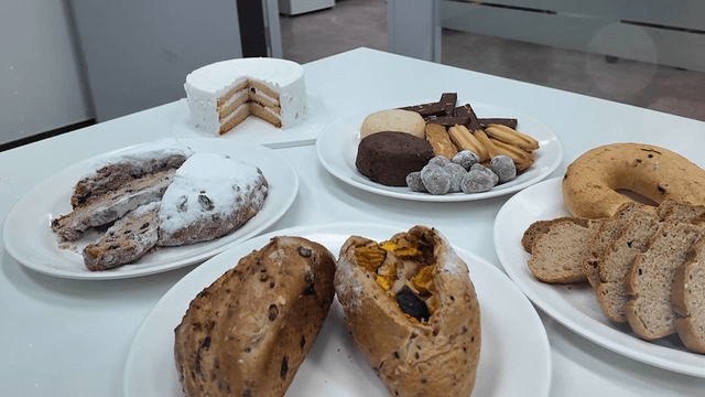 매대에 먹음직스럽게 진열된 다양한 종류의 빵