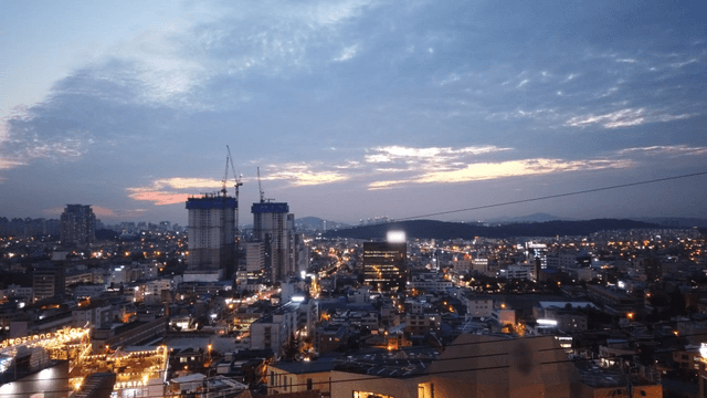 황혼에서 밤으로 변하는 도시