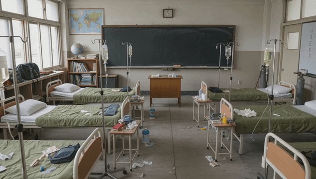 소독약으로 빈 교실을 방역하는 사람들