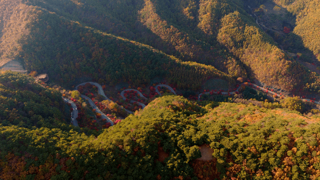 알록달록한 가을 숲을 지나는 구불구불한 도로