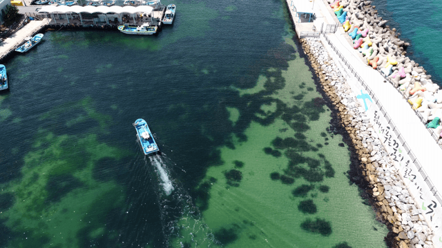 방파제 근처의 어선과 부유 플랫폼