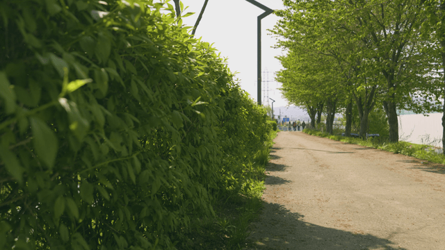 푸른 나무들이 늘어선 평화로운 공원의 길
