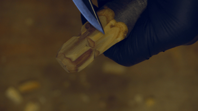 칼로 정교하고 세심하게 나무를 조각하는 손