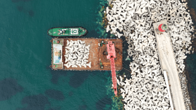 바다 위 바지선의 콘크리트 방파제 블록