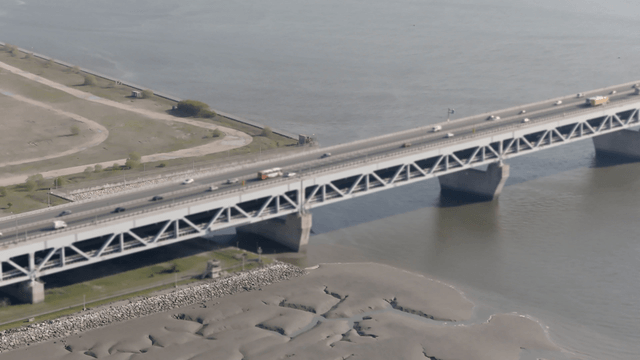 얼어붙은 강과 들 위를 지나는 고가도로 위 차량들