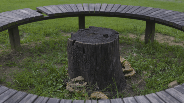 나무 그루터기에 놓인 뾰족한 나무 막대기들