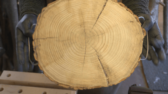 나무 바퀴에 끌로 작업하는 모습