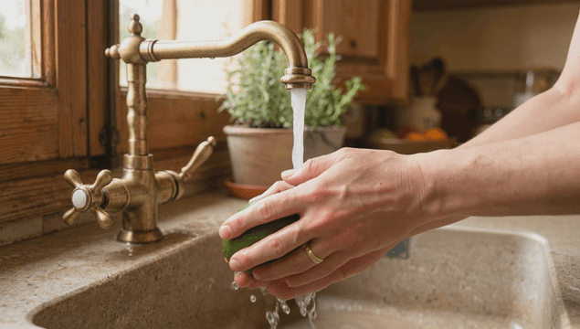 싱크대에서 흐르는 물로 고추를 씻는 사람