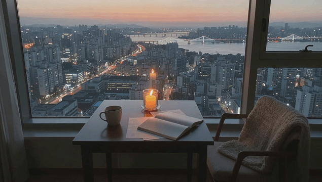 도시 전망과 함께 촛불이 켜진 테이블