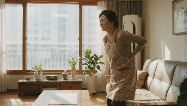 실내에서 허리 통증을 겪는 여성