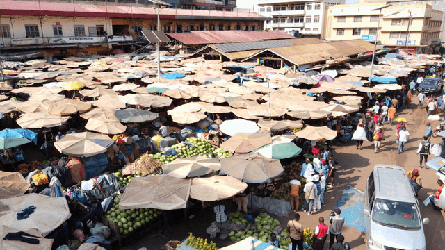 야외 시장의 금속 찜기에서 음식을 찌는 장면