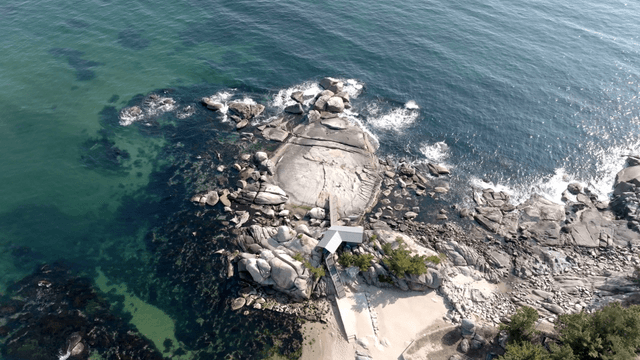 맑은 물이 흐르는 바위 해안을 거니는 사람들