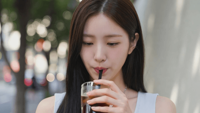 햇살 가득한 거리에서 아이스커피를 마시는 여성