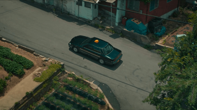 조용한 주거단지 근처 도로를 주행하는 자동차들