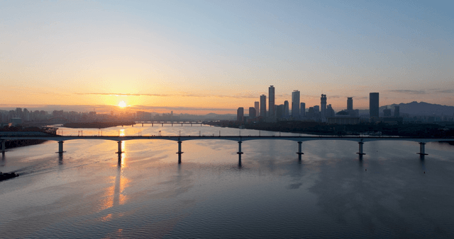 도시 스카이라인과 강 위의 일출