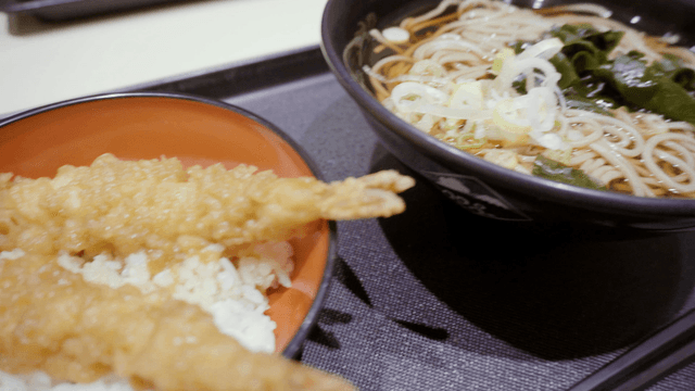 새우 튀김과 따뜻한 일본 우동