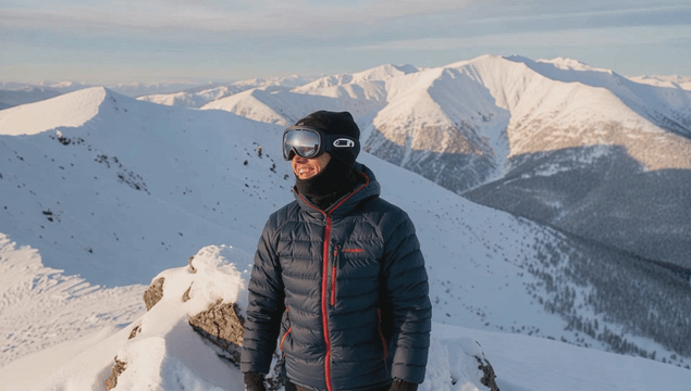 눈 덮인 산 정상에서 만세하며 기뻐하는 등산객