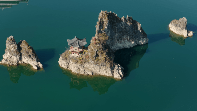 새벽에 바위섬과 정자가 있는 고요한 호수