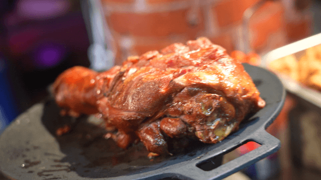 꼬치에 꽂힌 육즙 가득한 구운 오리고기