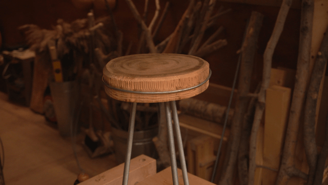 목공 작업실의 코르크 좌석 나무 의자