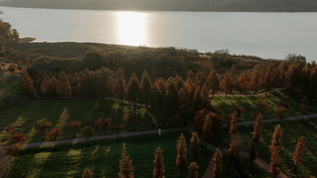 알록달록한 나무들로 둘러싸인 고요한 호수