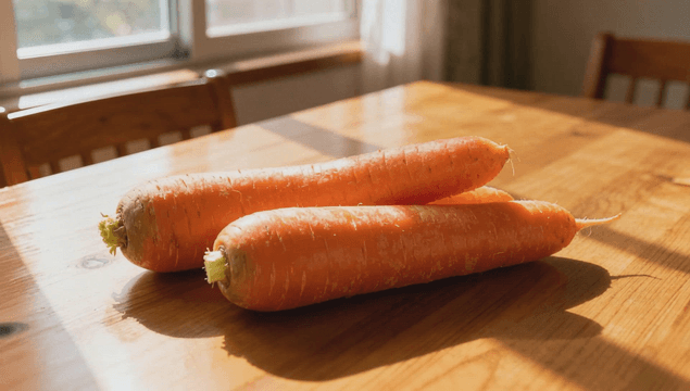 햇빛이 비치는 나무 테이블 위의 당근
